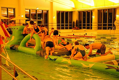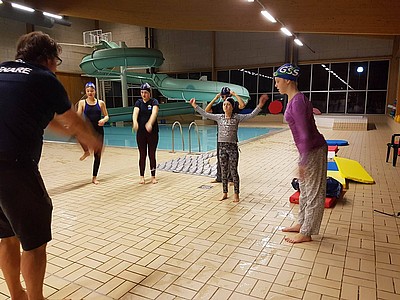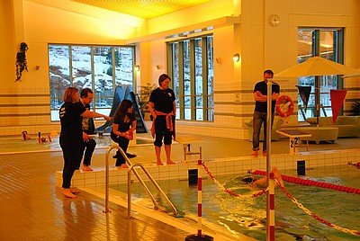 Fredag kväll var det tid för fri lek i bassängen men på lördag morgon började träningen på allvar. Lördag kväll var det Kahoot-quiz med kluriga frågor samt strumpbyxestafett.