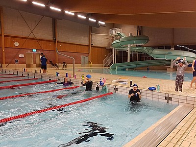 Några föräldrar passade på att gå Funktionärsutbildning, teori varvades med besök på bassängkanten.